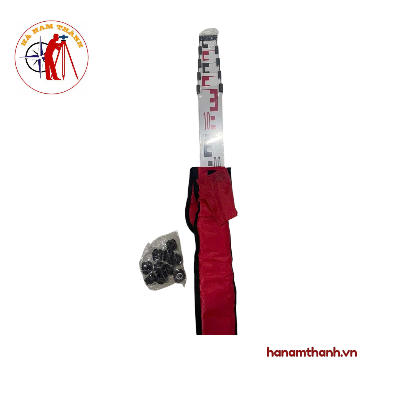 – Mia nhôm máy thủy bình được làm từ hợp kim nhôm chổng gỉ, mia được chia thành 5 đoạn có thể rút dài tối đa 5m và chiều dài thu gọn tối thiểu là 1,3m có thể dễ dàng vận chuyển trong quá trình đo đạc